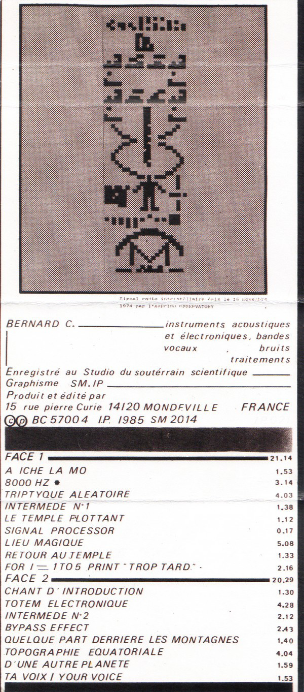 Antes de todo lo visto hasta el momento, en 1981 BERNARD C_ sacó este EP de 7" con cuatro temazos de sonido electrónico industrial de la vieja escuela francesa, tan emparentado sonoramente con DDAA como con VOX POPULI o incluso los belgas BENE GESSERIT. La mezcla de cajas de ritmo, sintetizadores, grabaciones de campo y tratamiento de voces es excelsa y adicitiva. Por cierto, descargado en WAV desde Soulseek.