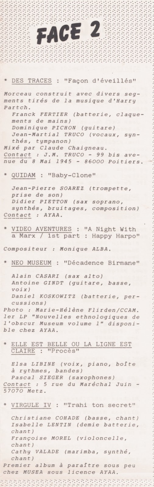 Cinco años más tarde, el sello AAA, reconvertido en AYAA RECORDS, lanza esta compilación en formato LP, también nutrida por músico y grupos franceses, de lo mejorcito de los ínclitos jardines sonoros galos de la segunda mitad de la década ochentera: SZENTENDRE, SOIZANTE ÈTAGES, BUIRETTE, NEO MUSEUM, ANNE GILLIS, VIDEO-AVENTURES, DES TRACES, entre otros.