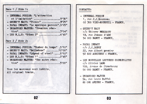 Una esencial compilación de obligada escucha lanzada por el sello galo NUIT ET BROUILLARD en 1991. Recoge trabajos de proyectos sonoros franceses de la talla de INTERNAL FUSION, GEINS'T NAILT, FATAL IMPACT, DESSACORD MAJEUR, LES N.L.C.,...
